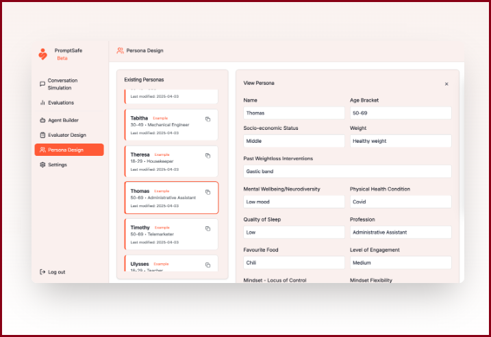 PromptSafe validates AI agents at scale, with realistic persona driven testing, based on the latest clinical research.